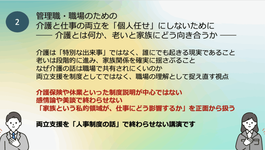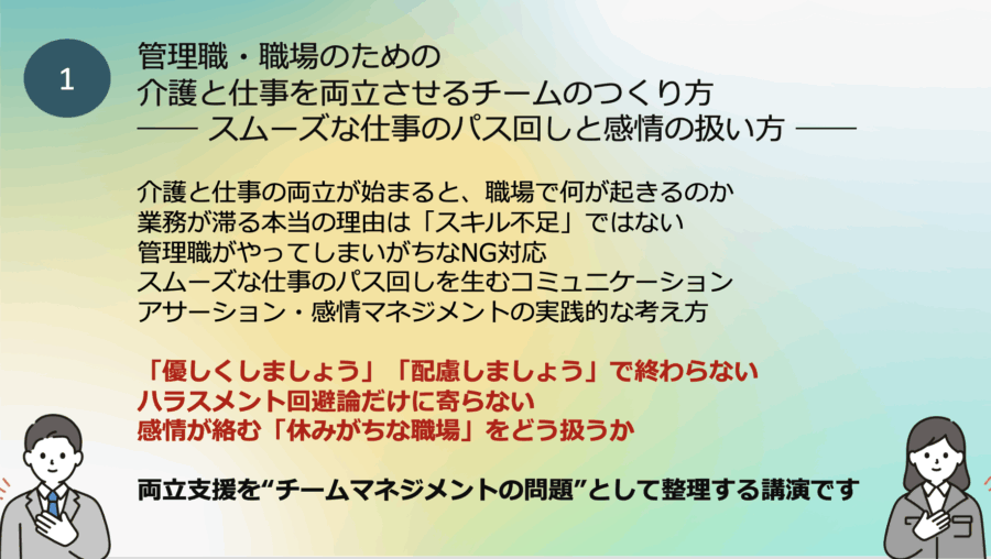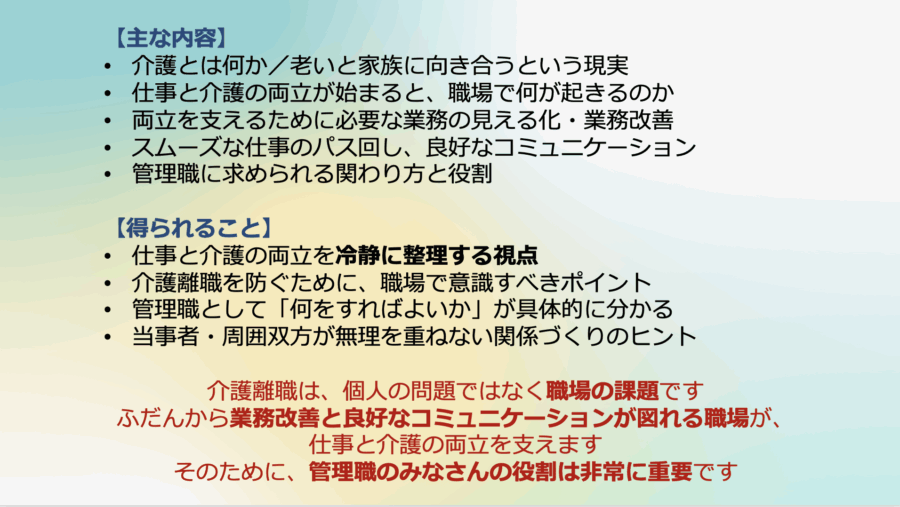 ワーキングケアラー/ビジネスケアラー/介護離職させない職場づくり